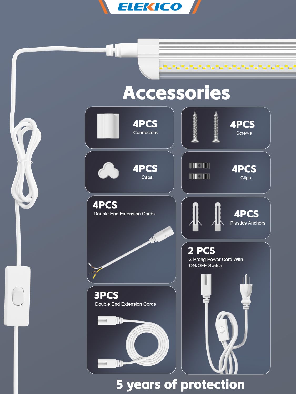 - What You Get--- 6x4FT Led Shop Light, 5x59inch Power cords with ON/OFF switch, 10xPower Cords, 10xInstallation accessories, 8x23.6inches Connector cables.